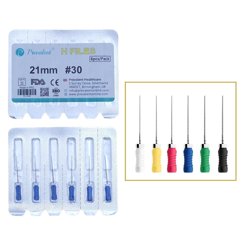 Prevalent’s H Files are precision-ground stainless steel instruments designed for efficient root canal shaping and debridement. Available in ISO sizes #06–#80 and lengths of 21 mm, 25 mm, 28 mm, and 31 mm, they offer strong cutting action and tactile control for safe and effective canal preparation.